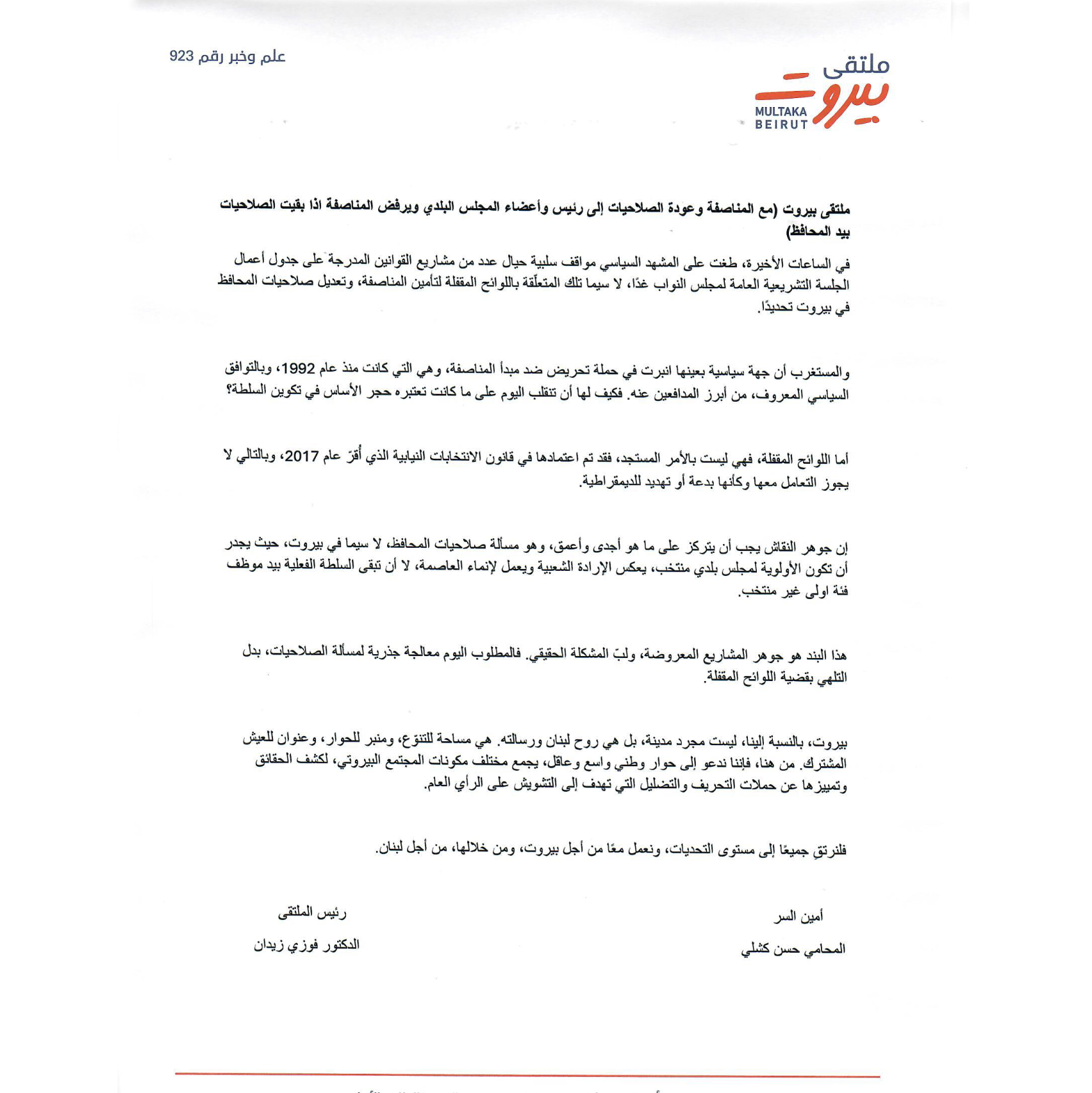 بيروت، بالنسبة إلينا، ليست مجرد مدينة، بل هي روح لبنان ورسالته. هي مساحة للتنوّع، ومنبر للحوار، وعنوان للعيش المشترك. من هنا، فإننا ندعو إلى حوار وطني واسع وعاقل، يجمع مختلف مكونات المجتمع البيروتي، لكشف الحقائق وتمييزها عن حملات التحريف والتضليل التي تهدف إلى التشويش على الرأي العام.